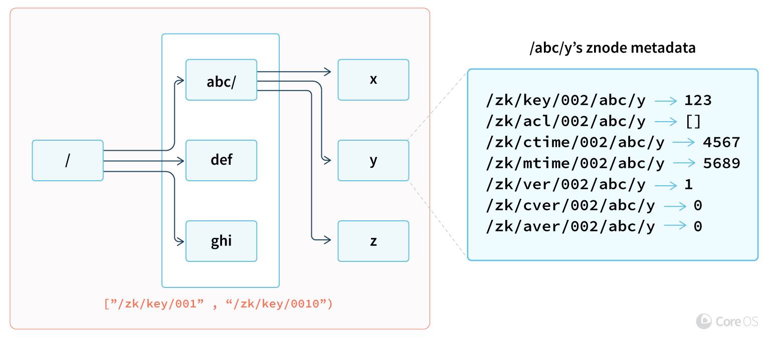 深入来讲,zetcd会将ZooKeeper的数据模型翻译成适配etcd API。对于key查找,zetcd将ZooKeeper层级式目录转换成etcd扁平的二分键值空间(flat binary keyspace)。为了管理元数据,当写入etcd后端时,zetcd利用内存级别的事务将信息安全、原子地更新为ZooKeeper znode信息。