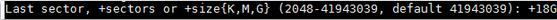 输入最后一个扇区或者分区大小的值。通常推荐输入分区的大小。总是添加前缀 + 以防止值超出范围错误。
