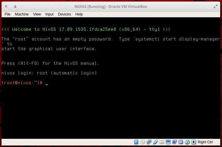 下载 ISO 映像后,我启动了 VirtualBox 并用下载的镜像创建了个新的虚拟机。VM 启动后,出来的是 Bash 的登录界面,界面上指导我用空密码去登录 root 账号,以及我该如何启动 GUI 显示管理器(图 1)。