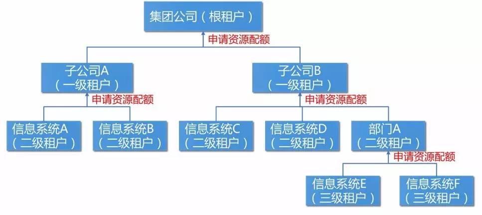如图 1 所示,云平台架构中需要设计多级租户,根租户对应的是整个集团公司,统一管理和分配集团公司范围的所有云资源,即云平台所管理的所有资源。一级租户对应子公司级别,是信息系统的承建和管理单位,一个子公司可以管辖多个信息系统。二级租户可对应为信息系统级别,是信息系统的具体建设和运维项目组;针对大的子公司还可以将二级租户对应到其内部的部门,然后在其下面再设立对应到信息系统的三级租户。当底层租户需要资源时,应当向上级租户申请资源配额,上级租户查看本租户当前可用的资源配额,如果足够就可以分配给下级租户,如果不够就再向更上一级租户申请资源配额。根租户的资源配额即为云平台的所有可用资源的集合,如果根租户的资源配额不够的话就意味着需要及时进行资源扩容。这种多层级的租户体系结构即是设计模式中 Composite 模式的具体应用。