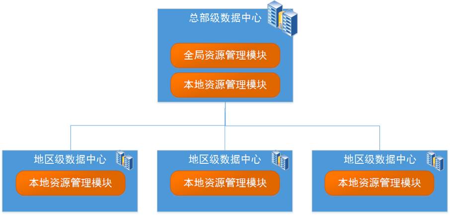 如图 2 所示,云平台需要设计两级资源管理体系,本地资源管理模块管理和控制本数据中心内的资源,将本数据中心的资源清单和资源使用情况上报全局资源管理模块,接收并执行全局资源管理模块下发的指令;全局资源管理模块收集并汇总各个本地资源管理模块上报的资源信息形成资源的全局视图,统一管理和调度位于所有数据中心的资源,下发指令给本地资源管理模块。从部署角度来看,本地资源管理模块会部署在每一个数据中心,包括总部级数据中心和地区级数据中心,而全局资源管理模块仅部署在总部级数据中心。