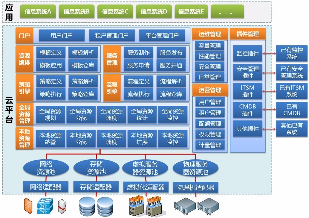 该云平台架包含资源适配器、资源池、资源管理模块(包括本地资源管理模块和全局资源管理模块)、策略引擎、流程引擎、资源编排模块、服务管理模块、门户模块、运营管理模块、运维管理模块和插件管理模块。下面的资源适配器负责适配、组织、整合底层异构 IT 资源,从而构建出各种资源池,资源适配器为上层资源管理模块提供了统一的资源管理 API。资源管理模块负责对资源池进行管理,按照资源的生命周期对资源池中的资源进行管理,根据用户的需求从资源池中分配、调度资源。