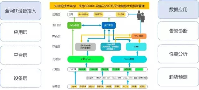 在可视化层面,我们的做法是通过纵向打通应用层、平台层和设备层,横向接入全网IT设备,采集全网数据,并在此基础上结合具体的算法去做展现的。