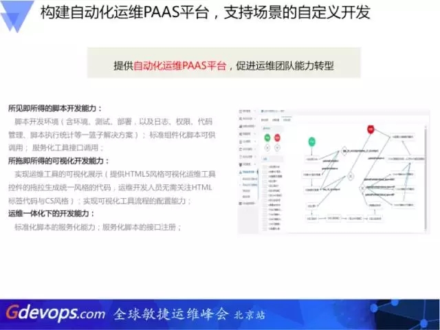 第四步,构建自动化运维PaaS平台:支持场景的自定义开发,驱动运维团队能力转型。要把标准化工作固化到平台里,没有放到平台的标准化都是无用功,没有场景驱动的运维就是假大空。你想想传统应用的功能做了多少不是场景应用的功能,有多少企业写了一堆的标准:操作标准、运维标准、安全规范……要满足一堆的标准,最后,这些标准在操作平台上有限制吗,在操作平台上管用吗,如果操作标准压根儿跟你的平台不对应,那就是一个摆设。