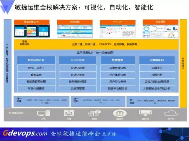 个是我们整体的敏捷运维全站的解决方案框架,以“可视化、自动化、智能化”为敏捷运维全栈解决方案的核心:通过“运维可视化”实现随时随地、全网透明的运维价值呈现;通过“运维自动化”全面提升运维服务效率和质量;通过“运维智能化”实现以智能化驱动运维能力。在这个过程中,我们通过运维分层构建,实现不同层级解决不同层次的问题。这就是我今天的分享,谢谢大家!