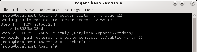 docker build -t my-apache2 . Sending build context to Docker daemon 2.048 kB Step 1 : FROM httpd:2.4 Trying to pull repository docker.io/library/httpd ... 2.4: Pulling from docker.io/library/httpd 8ad8b3f87b37: Pull complete c95e1f92326d: Pull complete 96e8046a7a4e: Pull complete 00a0d292c371: Pull complete 3f7586acab34: Pull complete Digest: sha256:3ad4d7c4f1815bd1c16788a57f81b413...a915e50a0d3a4 Status: Downloaded newer image for docker.io/httpd:2.4 ---> fe3336dd034d Step 2 : COPY ../public-html/ /usr/local/apache2/htdocs/ ...