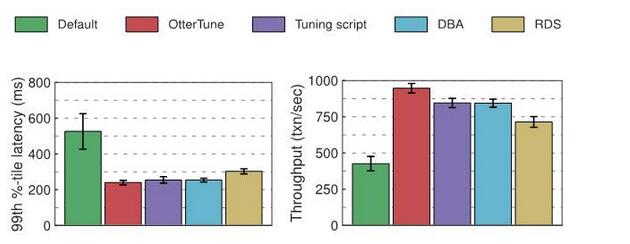 将OtterTune生成的最佳配置与调优脚本和RDS生成的配置进行比较,就会发现:如果使用OtterTune配置,MySQL的延迟缩短了约60%,吞吐量提升了35%。OtterTune还生成了结果与数据库管理员选择的配置一样好的配置。