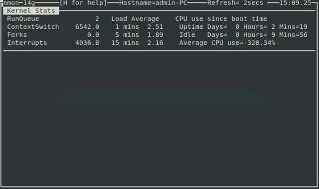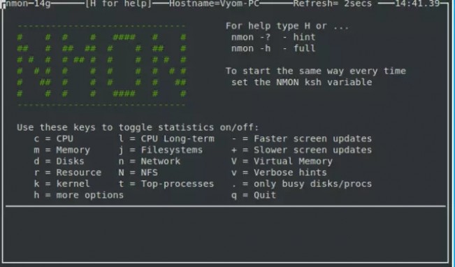 从上面的截图可以看到 nmon 命令行工具完全是交互式运行的,你可以使用快捷键来轻松查看对应的统计数据。你可以使用下面的 nmon 快捷键来显示不同的系统统计数据: