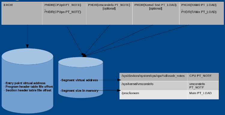 kexec-tools 读取 /sys/devices/system/cpu/cpu%d/crash_notes 并准备 CPU PT_NOTE 的标头。同样,它读取 /sys/kernel/vmcoreinfo 并准备 vmcoreinfo PT_NOTE 的标头,从 /proc/iomem 读取系统内存并准备存储器 PT_LOAD 标头。当“捕获内核”接收到 elfcorehdr 时,它从标头中提到的地址中读取数据,并准备 vmcore。