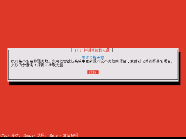 选择继续之后,提示说这一步安装失败,让我们重新挂载CD-ROM之后再继续。