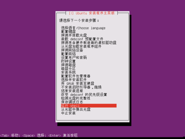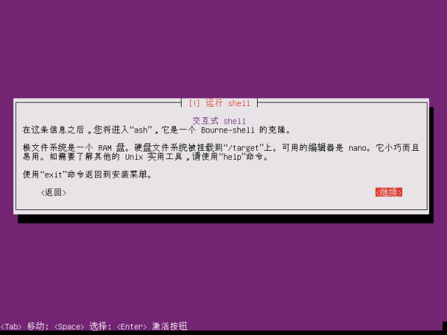 在上面的界面上选继续后会出现下面的界面,这个时候选择运行shell,会进入一个shell界面。