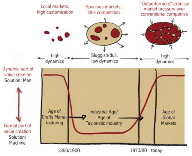 - 1900 年到 1980 左右被称为泰勒工业时代,这个时代价值创造的主体是机器,市场广阔缓慢,竞争少,通过机器化和规模化生产提升效率和比拼低成本是这个时代市场的主要特点。