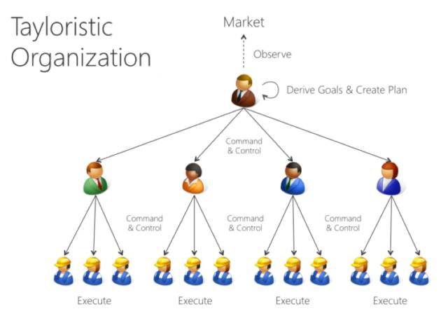 上图是泰勒工业时代主流的泰勒型组织架构,也称命令控制型(Command&Control)组织。组织由领导层观察市场,制定目标计划,中层经理长传下达,下层员工负责执行。