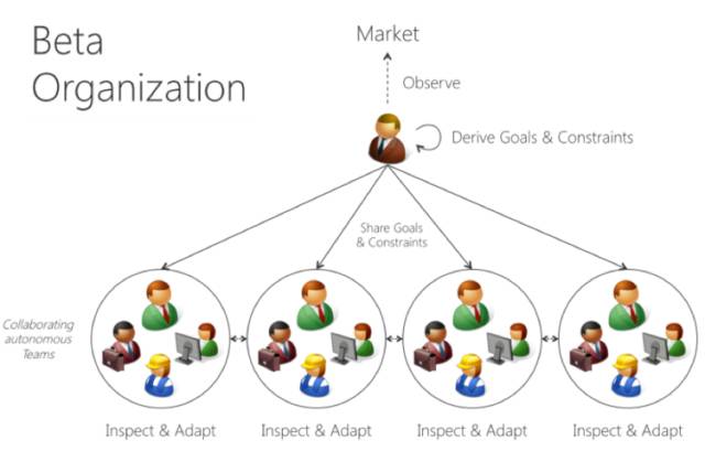 上图是后工业时代逐渐兴起的贝塔型组织,常见于一些新兴行业如互利网业务公司。这类组织仍有领导层集中观察市场,制定共享的目标和约束,但是组织架构层级较扁平,团队组织偏向跨职能混搭和协作,快速响应市场变化。