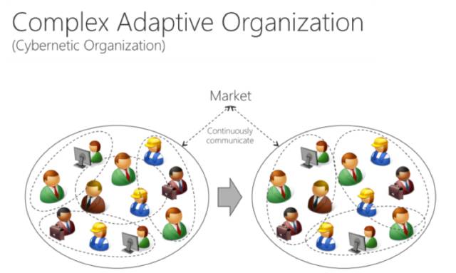 上图的复杂自适应组织架构,也称控制反馈式组织架构(Cybernetic Organization),目前在成型公司中比较少见(仅见于少数创业公司),但却是未来组织架构新趋势。该架构没有集中式目标设定,由跨职能混搭和协作的团队和市场直接对接,持续和市场沟通获取需求,快速灵活响应市场变化。
