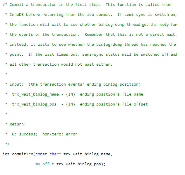 接下来,我们来看repl_semisync.commitTrx 这个函数,这个函数有两个传入参数,一个是binlog文件,一个binlog文件的位移。我们来看这个函数的含义吧。算了,还是直接用源码的注释来解释吧。