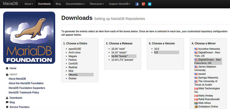在 CentOS/RHEL 7和Ubuntu(14.04或更高版本)上,最新的 MariaDB 已经包含在其官方源。在 Fedora 上,自19版本后MariaDB 已经替代了 MySQL。如果你使用的是旧版本或 LTS 类型如 Ubuntu 13.10 或更早的,你仍然可以通过添加其官方仓库来安装它,在MariaDB官网提供了一个在线工具帮助你依据你的 Linux 发行版中来添加MariaDB的官方仓库。此工具为 openSUSE, Arch Linux, Mageia, Fedora, CentOS, RedHat, Mint, Ubuntu, 和 Debian 提供了 MariaDB 的官方仓库.