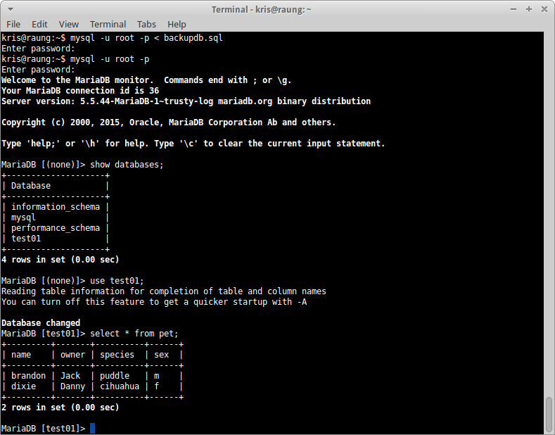 $ mysql -u root -p ......................................//以下为sql命令 MariaDB [(none)]> show databases; MariaDB [(none)]> use test01; MariaDB [test01]> select * from pet;