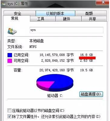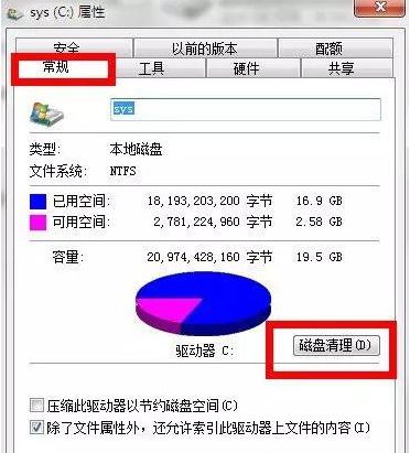 2、点击属性,会弹出属性界面对话框如下图,看到在常规下会有个磁盘清理。