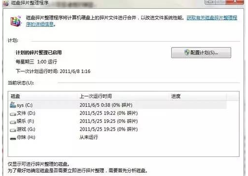 2、弹出磁盘碎片整理程序,可以看到有配置计划,分析磁盘,碎片整理等按钮
