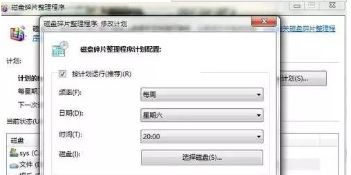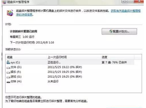 3、点击配置计划可以看到设置每个星期自动磁盘碎片整理(又一次见到Win7的人性化),当然如果你不喜欢的话可以不招待这个计划