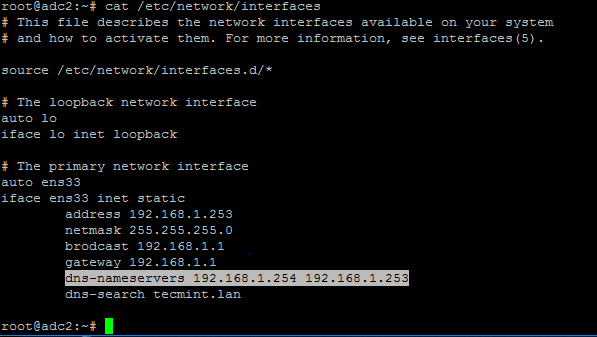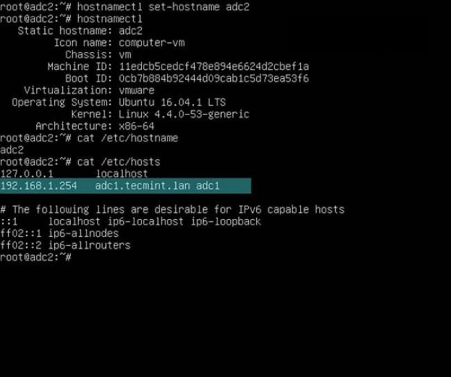 在这篇教程中,主域控服务器的主机名为 adc1.tecmint.lan ,其对应的 IP 地址为 192.168.1.254 。