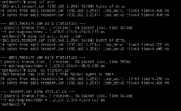 为了测试 DNS 解析是否正常,使用一系列 ping 命令测试,命令后分别为简写名, FQDN 名和域名,如下图所示: