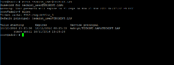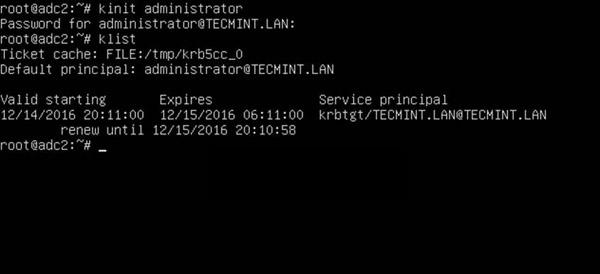 所有依赖包安装完成后,通过使用 kinit 命令为域管理员请求一个 Kerberos 票据以验证设置是否正确。使用 klist 命令来列出已授权的 kerberos 票据信息。