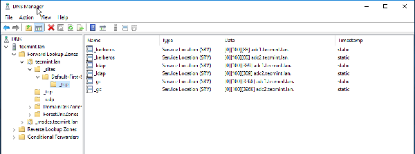 这些 DNS 记录也可以从注册过的已安装了 RSAT 工具的 Windows 机器上查询到。打开 DNS 管理器,展开到你的域 tcp 记录,如下图所示: