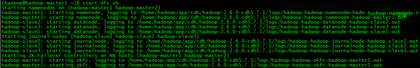 // 启动zookeeper集群(分别在slave1、slave2和slave3执行) $ zkServer.shstart // 启动HDFS(在master1执行) $ start-dfs.sh 备注:此命令分别在master1/master2节点启动了NameNode和ZKFC,分别在slave1/slave2/slave3节点启动了DataNode和JournalNode,如下图所示。