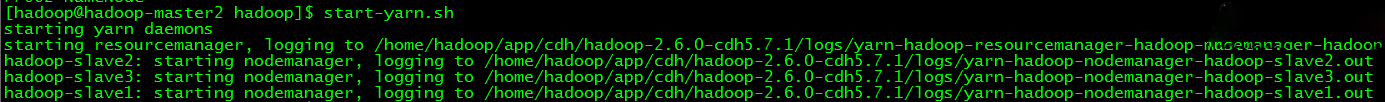 // 启动YARN(在master2执行) $ start-yarn.sh 备注:此命令在master2节点启动了ResourceManager,分别在slave1/slave2/slave3节点启动了NodeManager。