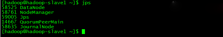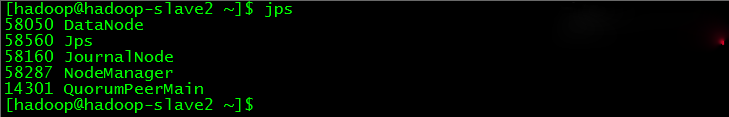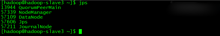 hadoop-slave1、hadoop-slave2和hadoop-slave3分别开启了DataNode、JournalNode、NodeManager和ZooKeeper,如下图所示: