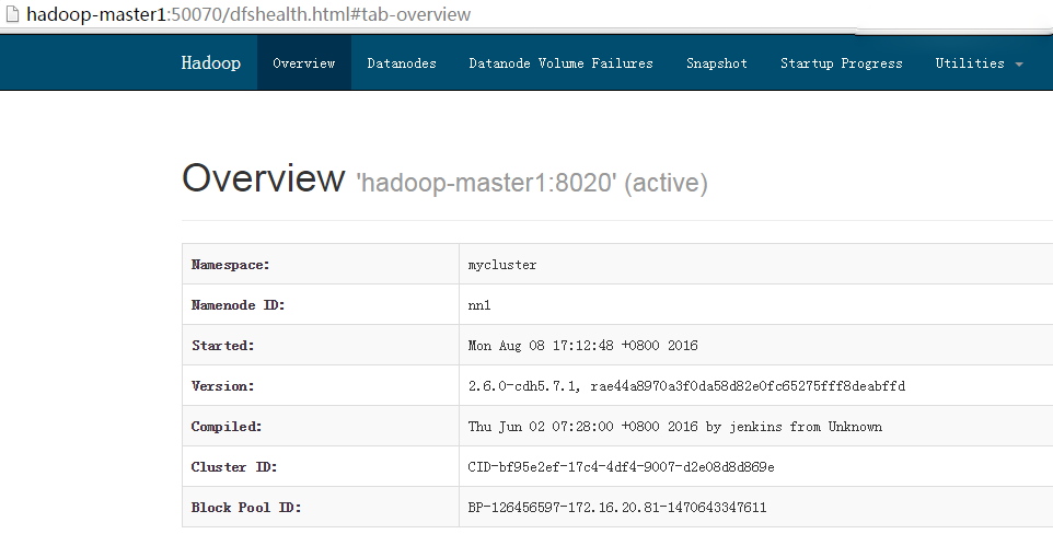 下图为http://hadoop-master1:50070,可看到NameNode为active状态: