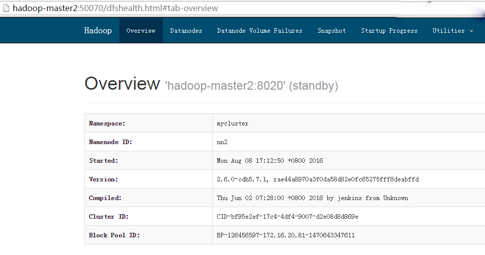 下图为http://hadoop-master2:50070,可看到NameNode为standby状态: