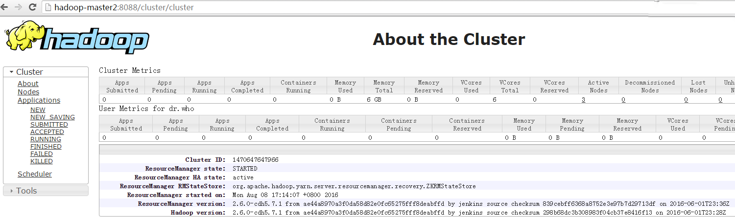 下图为http://hadoop-master2:8088,可看到ResourceManager为active状态: