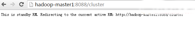 下图为http://hadoop-master1:8088,可看到ResourceManager为standby状态,它会自动跳转到http://hadoop-master2:8088: