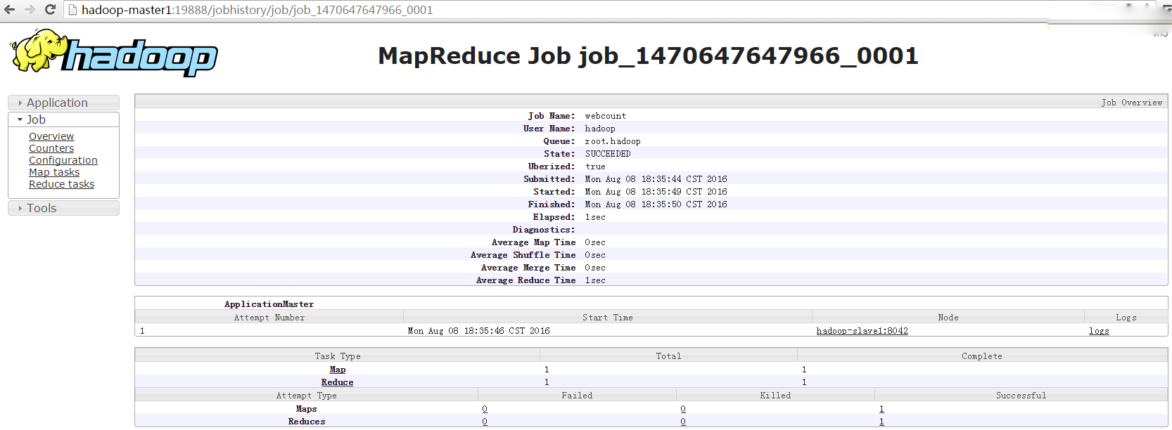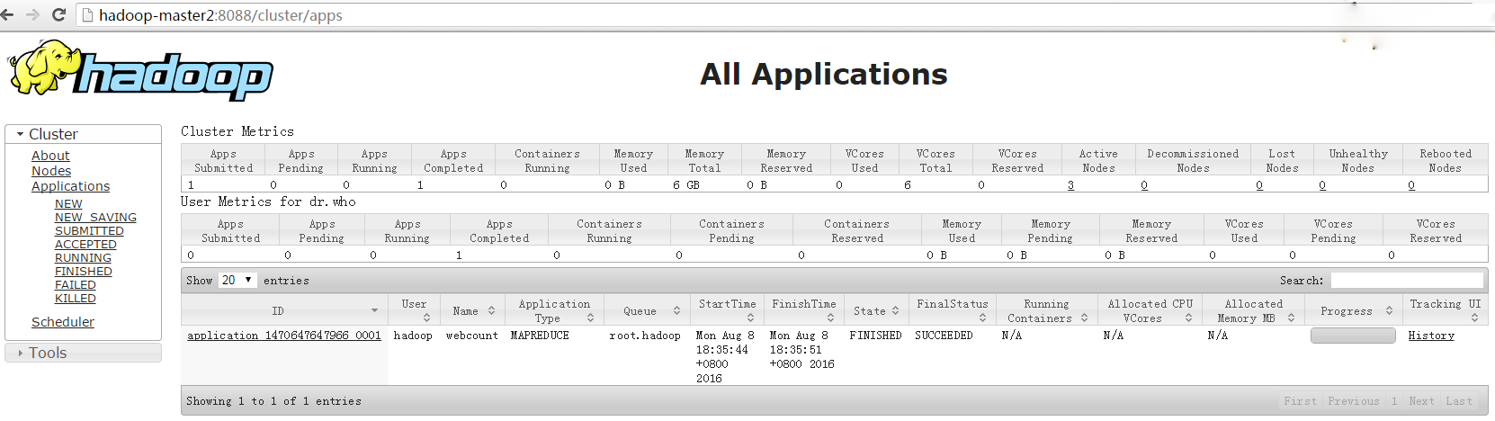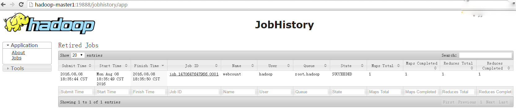 下图为http://hadoop-master1:19888,可查看历史任务信息:
