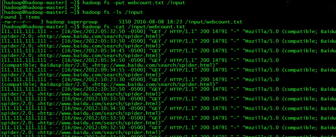 // 向HDFS上传数据 $ hadoopfs -put webcount.txt /input // 查看HDFS上的数据 $ hadoopfs -ls /input $ hadoopfs -cat /input/webcount.txt