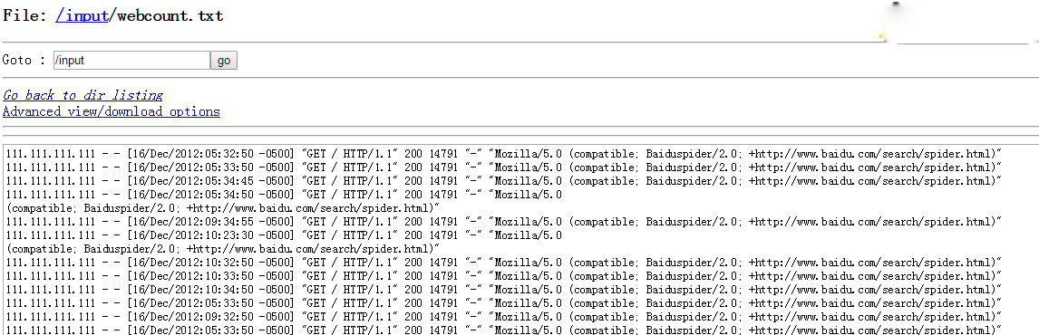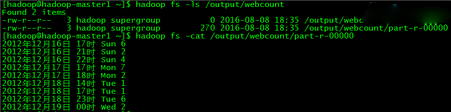 // 在HDFS查看结果 $ hadoopfs -ls /output/webcount $ hadoopfs -cat /output/webcount/part-r-00000