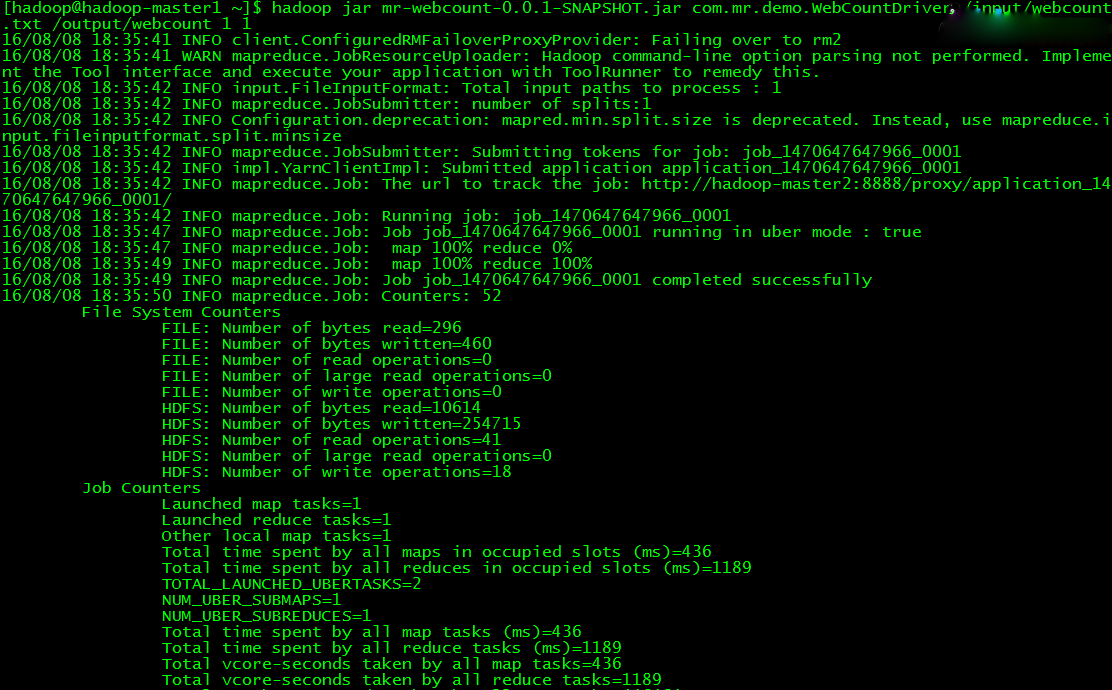 $ hadoopjar mr-webcount-0.0.1-SNAPSHOT.jar com.mr.demo.WebCountDriver/input/webcount.txt /output/webcount 1 1