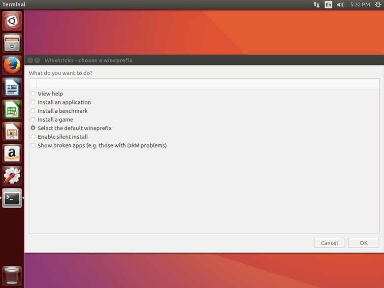 当窗口第一次打开时候,将会给你一个有 “查看帮助”View help 和 “安装应用”Install an application 选项的菜单。一般情况下,我们选择 “选择默认的 wineprefix”Select the default wineprefix,这将是你主要使用的选项。其他的也能用,但是不推荐使用。接下来,单击 “OK”,你就会进入到 WINE prefix 的配置菜单,你可以在这完成所有你要使用 winetricks 完成的事情。