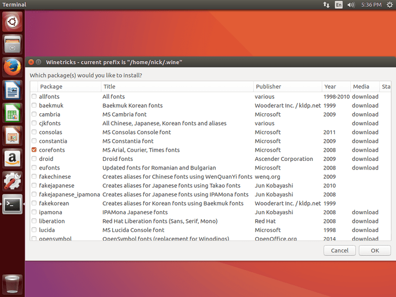 字体一直很重要,一些应用程序没有字体就没法正常的加载。winetricks 可以轻松地安装许多常用 Windows 字体.在配置菜单中,选中 “安装字体”Install a font 单选按钮,然后点击 “OK” 即可。 然后你就会得到一列字体清单,它们都有着相对应的复选框。你很难确切知道你到底需要什么字体,所以一般按每个应用决定使用什么字体,我们可以先安装一款插件 corefonts,它包含了大多数 Windows 系统中应用程序所设定的字体。安装它也十分简单,所以可以试试。 要安装 corefonts ,请选择相应的复选框,然后点击 “OK”,你就会看到和在 Windows 下差不多的提示,字体就会被安装了。完成了这个插件的安装,你就会回到先前的菜单界面。接下来就是安装你需要的别的插件,步骤相同。