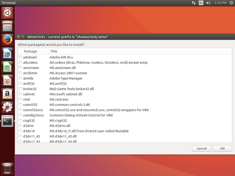 winetricks 可以通过命令行运行,在行末指定要安装的东西。但是大部分情况下,你都不知道 .dll 文件或者是你想安装字体确切的名字,那么,这时候最好利用图形界面程序。启动这个程序和其他程序没什么不同,就是在末尾什么都别输入就行了。