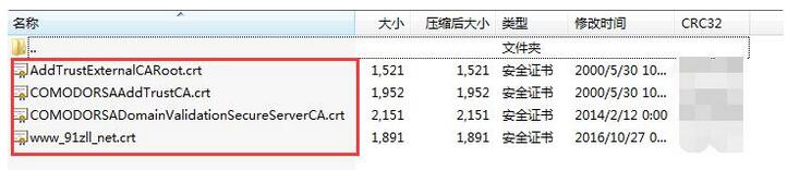 购买完成后,邮件会得到几封邮件,其中包含 key 代码、证书压缩包等附件,解压之会得到 4 个文件。AddTrustExternalCARoot.crt、COMODORSAAddTrustCA.crt、COMODORSADomainValidationSecureServerCA.crt、www_91zll_net.crt,这就是我们要用到的证书了。