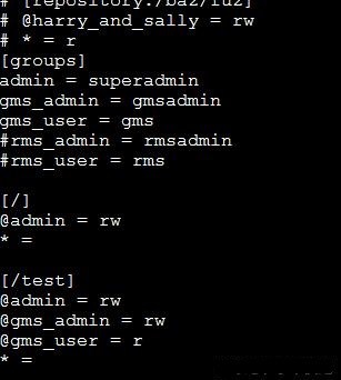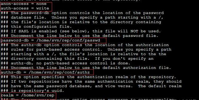 anon-access = read #匿名用户可读 none 无权限 auth-access = write #授权用户可写 password-db = /home/svn/rep/conf/passwd #使用哪个文件作为账号文件 authz-db = /home/svn/rep/conf/authz #使用哪个文件作为权限文件 realm = /home/svn/rep # 认证空间名,版本库所在目录