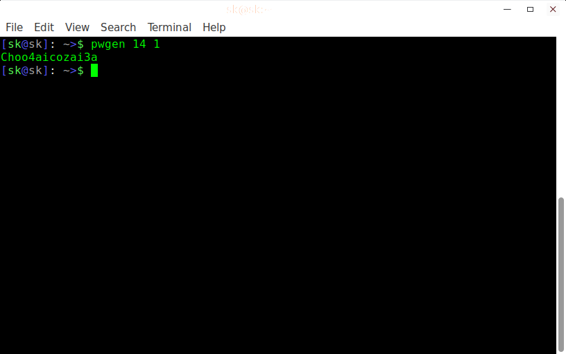 pwgen 安装完成后,便可以使用下面的命令来生成一个长度为 14 个字符的随机高强度密码: