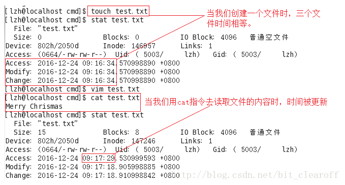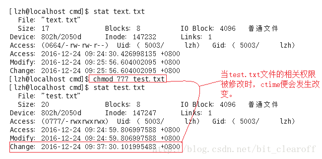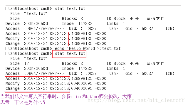 现在你可能会明白刚才修改文件的mtime时为什么文件的ctime也会跟着被改变了吧,因为当文件的内容被修改,文件的大小即size是一定会发生改变的,所以文件的状态时间会随着文件的内容被修改从而被更新。所以说文件的mtime被修改,该文件的ctime也会被改变。