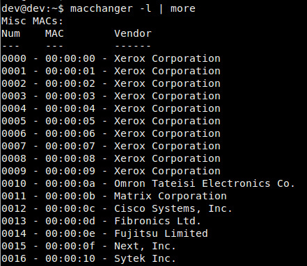 $ sudo macchanger --mac=00:00:00:00:00:01 eth0