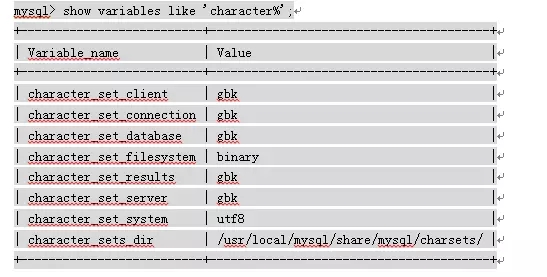 通过SHOW VARIABLES LIKE ‘character%’,在上面例子中通过语句获得字符集设置情况如下:
