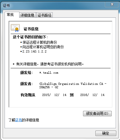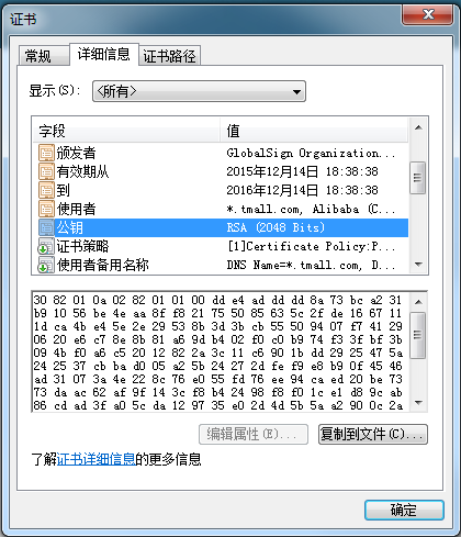 第三步,服务器向客户端返回证书。证书里面包含了很多信息:比如域名,申请证书的公司,公钥等。以下是一个淘宝网的CA证书。